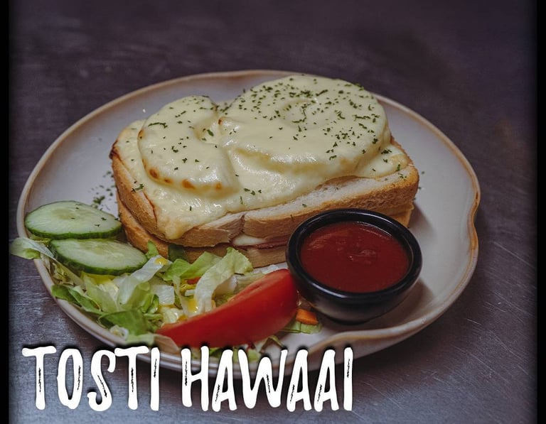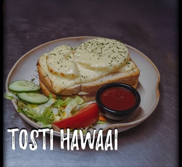 Met ambachtelijke ham en/of kaas en ananas, geserveerd met slagarnituur en cocktailsaus.