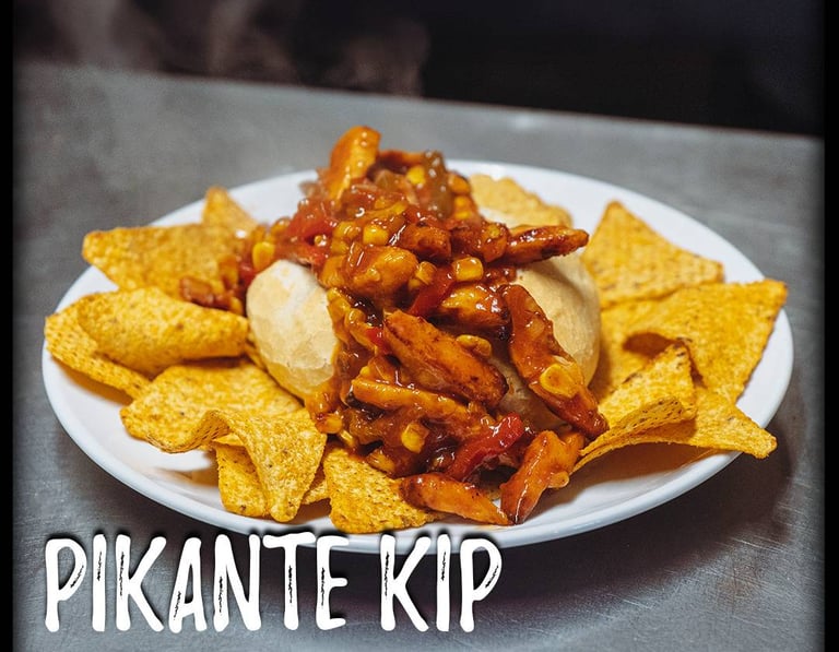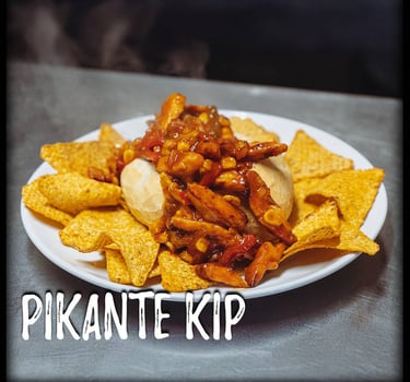 Italiaanse bol gevuld met kipfilet, paprika, mais, ui en een pikante saus van paprika en cajunkkruiden, geserveerd met tortillachips.