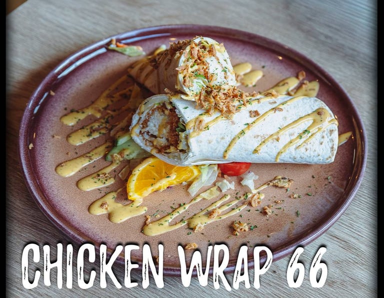 XL Wrap met roomkaas, krokant gefrituurde kippenhaasjes, gemengde sla, gedroogde uitjes en honing-mosterd